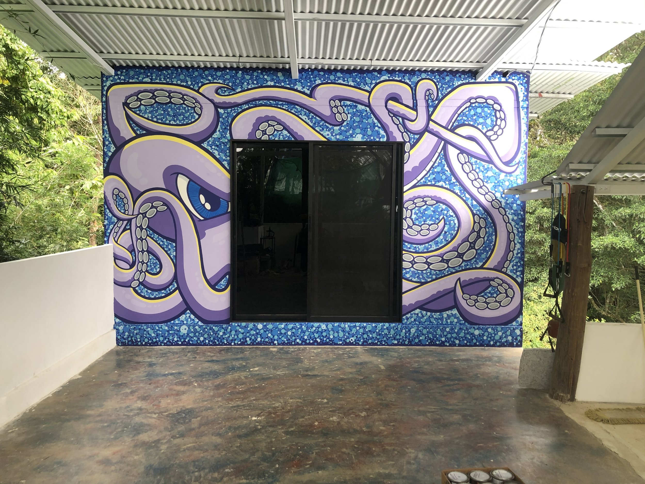 Time and tide, as they say, wait for no one. But sometimes, the stars do align. After much time and schedule mismatches, the moment finally arrived for an old friend’s long awaited octopus mural to come to life. The water and bubbles surrounding the octopus were meticulously crafted in the pointilism style, lending depth and dynamism to the scene. Every dot and detail stands as a testament to patience, persistence, and the joy of creativity. Yewwww!!!!!!!